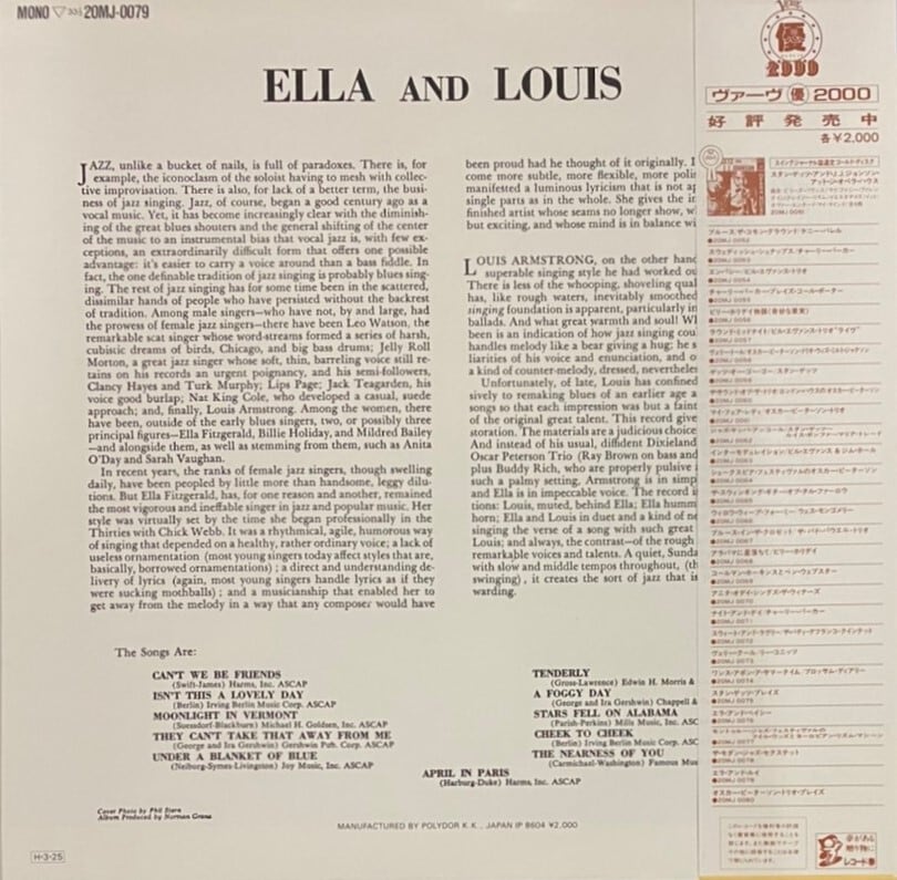 世紀の大スター「エラ・フィッツジェラルド」&「ルイ・アームストロング」の黄金コンビが贈る、古きよき時代のジャズがたのしめる、オリジナルは1956年。